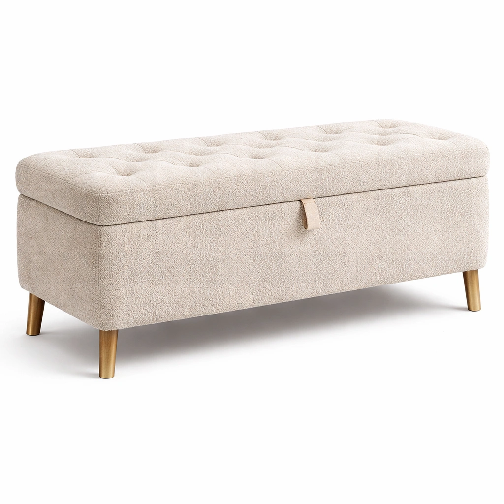 Banco de almacenamiento beige de tela de poliéster con patas de madera de haya