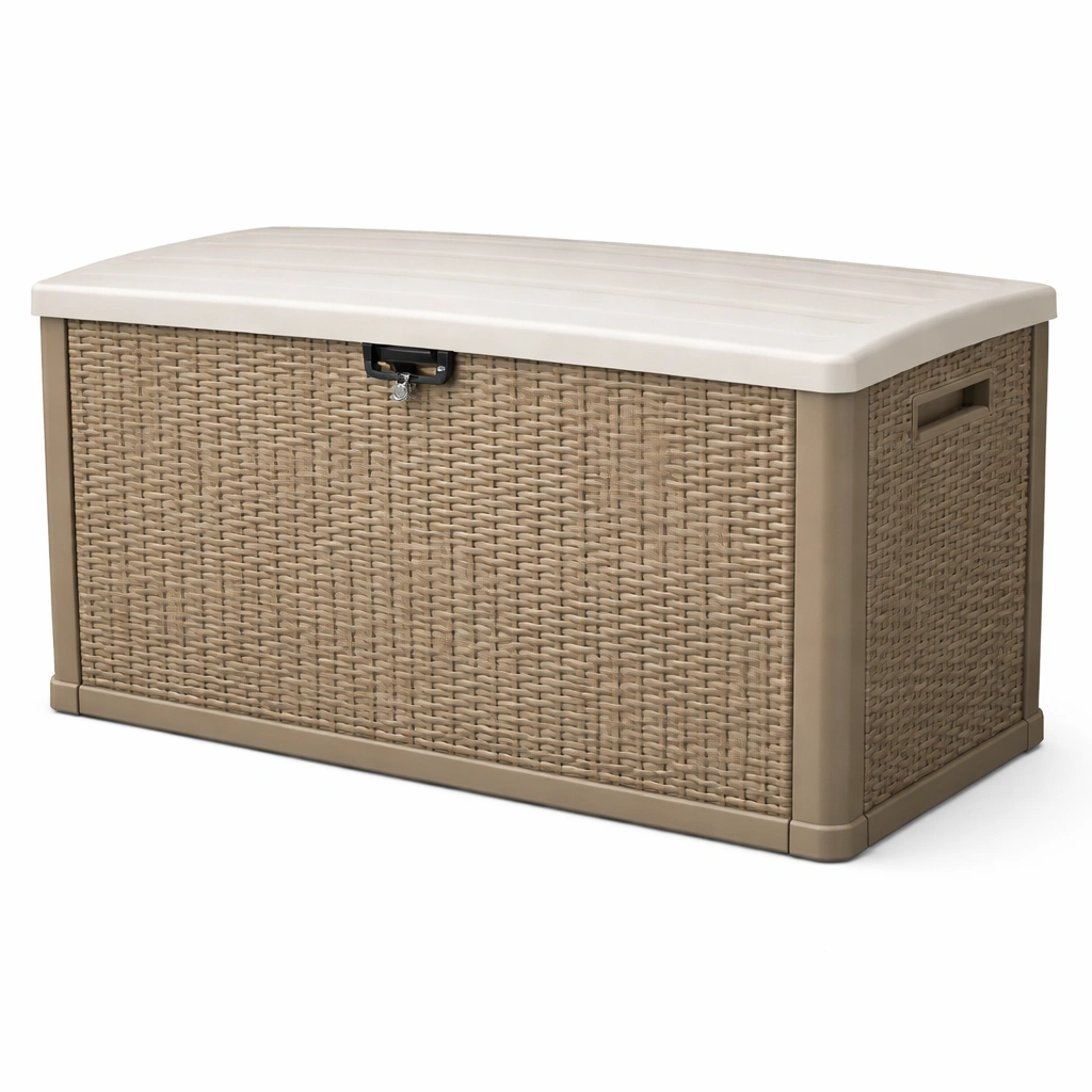 Este baúl de almacenamiento está fabricado con resina moldeada que imita el ratán. La tapa también está hecha de resina, brindando resistencia al agua y al polvo.